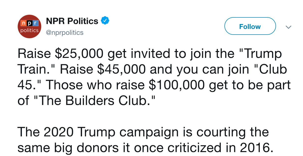 Campaigns then reward people who get others to donate the most amount of money. "Club 45" donors, who raise $45,000, get invited to a Trump donor retreat. The biggest donors get VIP event access with the president.