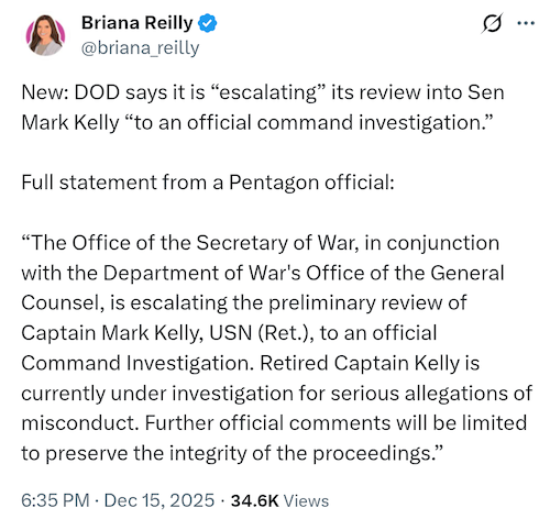The Department of Defense is upgrading its preliminary review of Mark Kelly to an official investigation.