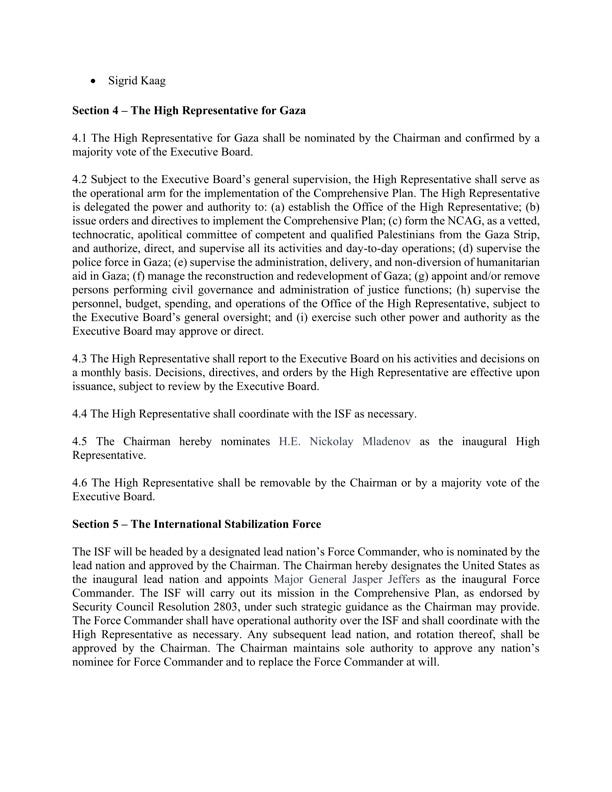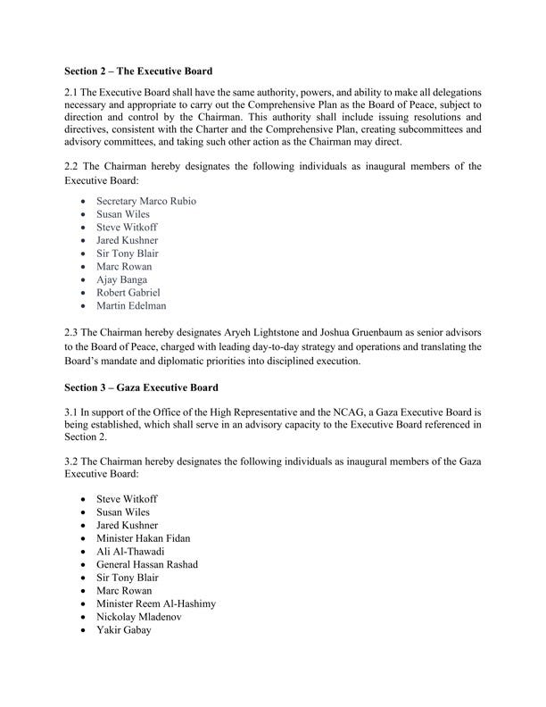 Exclusive: Leaked “Board of Peace” Resolution Outlines U.S.-Led Plan to Rule Over GazaThe draft framework, obtained by Drop Site, would bestow sweeping authority on Trump to determine all aspects of Gaza’s governance and future.Drop Site is a reader-funded, independent news outlet. Without your support, we can’t operate. Please consider making a 501(c)(3) tax-deductible donation today. ![]() The so-called Board of Peace that President Donald Trump officially launched in Davos, Switzerland last week is developing sweeping plans for a U.S.-backed administration to rule Gaza, according to a draft of the Board’s resolution. Drop Site obtained the unsigned document, which is dated January 22, 2026 and titled “Resolution No. 2026/1,” from three independent sources, all of whom are in regular contact with U.S. and Israeli authorities regarding Gaza reconstruction. The sources confirmed that its contents align with ongoing discussions in Israel and the U.S. about the implementation of planned governance structures for the Strip. The resolution, which is the first of its kind from the Board of Peace, details the structure of a U.S.-backed governing authority that would assume full legislative, executive, and judicial control over Gaza, including “emergency powers.” The stated goal of the Board of Peace is to transform Gaza into a “deradicalized and demilitarized terror-free zone that does not pose a threat to its neighbors.” The copy of the document obtained by Drop Site is unsigned. A blank space is left for the signature of Donald J. Trump, in his capacity as Chairman of the Board of Peace. It remains unclear whether the resolution has been formally adopted, or whether the version received reflects a final text. The metadata indicates that the document was first created in mid-December by the State Department—and the date on the document corresponds to President Trump’s appearance at the World Economic Forum in Davos, Switzerland, where he formally presided over the official launch of his board. The State Department did not respond to an inquiry from Drop Site about the resolution. The draft resolution formalizes a hierarchical structure for the Board of Peace, with Trump as the chairperson and an executive board that has “the same authority, powers, and ability to make all delegations necessary and appropriate to carry out the Comprehensive Plan as the Board of Peace.” The Executive Board has the power to “enact new law, or modify or repeal prior” civil and criminal laws in Gaza. The resolution lists the nine members of the executive board: seven that were already announced by the White House on January 16, plus two more who have not been publicly named. The previously announced members are: Secretary of State Marco Rubio, Special Envoy Steve Witkoff, former UK Prime Minister Tony Blair, Trump son-in-law Jared Kushner, businessman Mark Rowan, World Bank President Ajay Banga, and Deputy National Security Advisor Robert Gabriel. The two new names revealed in the document are Trump’s chief of staff Susan Wiles and Martin Edelman, a real estate attorney and a special advisor to the government of the United Arab Emirates. There will also be a Gaza Executive Board, which includes several of the same members serving in an advisory capacity. The draft resolution would also establish a National Committee for the Administration of Gaza (NCAG), described as a “vetted, technocratic, apolitical committee” of Palestinians operating strictly under the supervision of a High Representative. The High Representative is named as Nickolay Mladenov, the former Bulgarian defense and foreign minister and a former U.N. envoy to the Middle East. The NCAG would be led by Ali Shaath, a former Palestinian Authority government official. No Palestinians were included on the Board of Peace, though Trump did give a spot to Prime Minister Benjamin Netanyahu, who remains under war crimes indictment and is subject to an arrest warrant by the International Criminal Court. The board, which critics say is an attempt to circumvent any meaningful U.N. oversight or even to position itself as a privatized alternative to the world body, envisions operating in an environment where it answers exclusively to Trump. “It’s sadly the case that neither the Board of Peace nor its subordinate structures are representative or accountable. This may be seen in the untrammeled power of the Chairman, Mr. Trump himself,” the former United Nations Under-Secretary-General for Humanitarian Affairs and now Executive Director of Mediation Group International, Martin Griffiths, told Drop Site. He added that this imbalance is most evident in the resolution’s treatment of Palestinians, whose involvement is reduced “to the lowest and most technical level.” The draft resolution states that “only those persons who support and act consistently” to create a “deradicalized terror-free Gaza that poses no threat to its neighbors” will be eligible to “participate in governance, reconstruction, economic development, or humanitarian assistance activities in Gaza.” It bars from participation any individuals or organizations deemed to “have supported or have a demonstrated history of collaboration, infiltration or influence with or by Hamas or other terror groups.” It does not make clear how these determinations will be made but that the Executive Board and the High Representative will create “eligibility standards for participation in the development of New Gaza” and apply those on a case-by-case basis subject to Trump’s approval. Both Israel and the U.S. have repeatedly denounced without credible evidence UN agencies and nongovernmental organizations as fronts for Hamas or enablers of terrorism. The Board of Peace draft would establish “humanitarian zones” and “controlled civilian-protection corridors,” patrolled by the International Stabilization Force. Access would be restricted to indiv