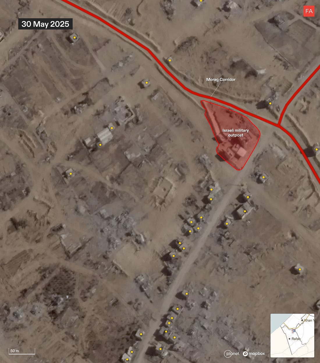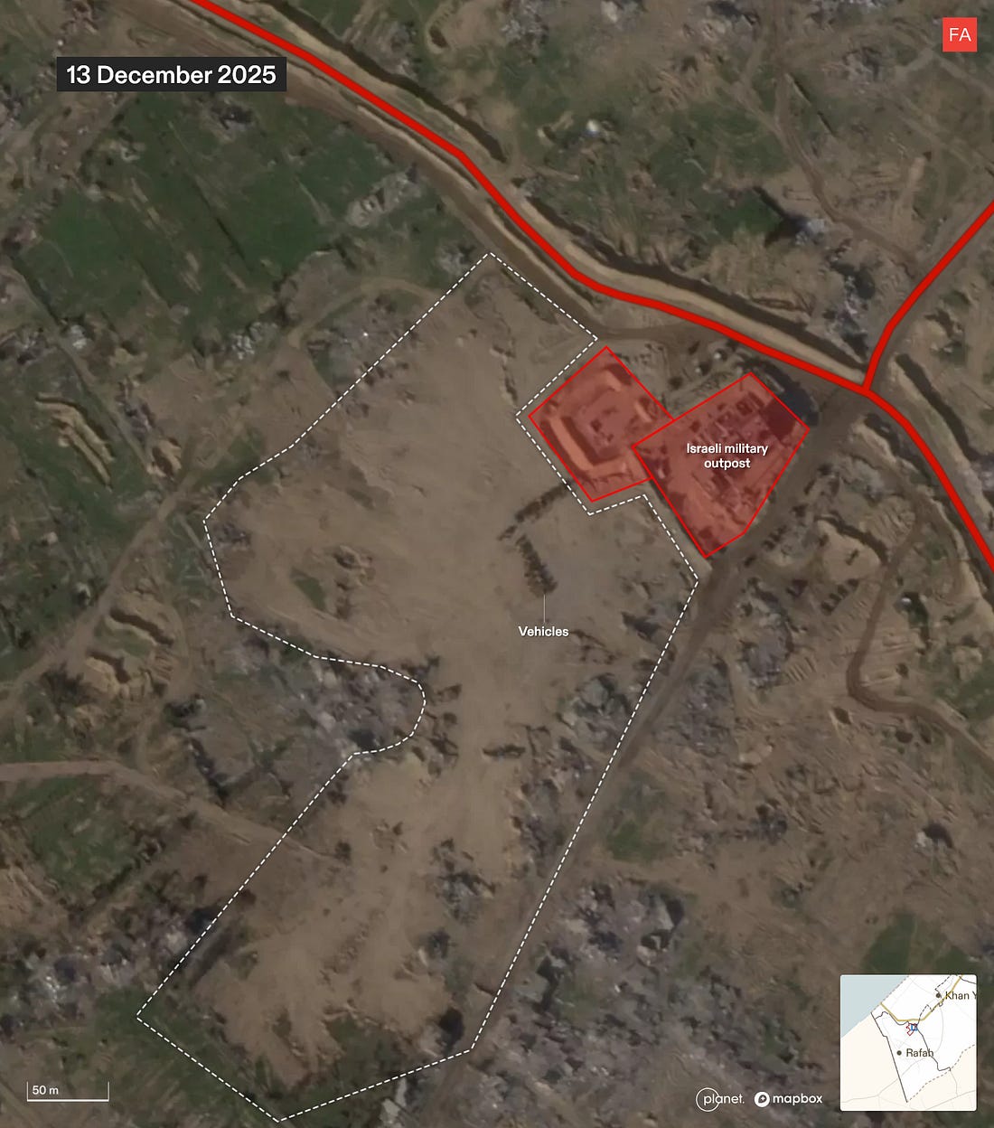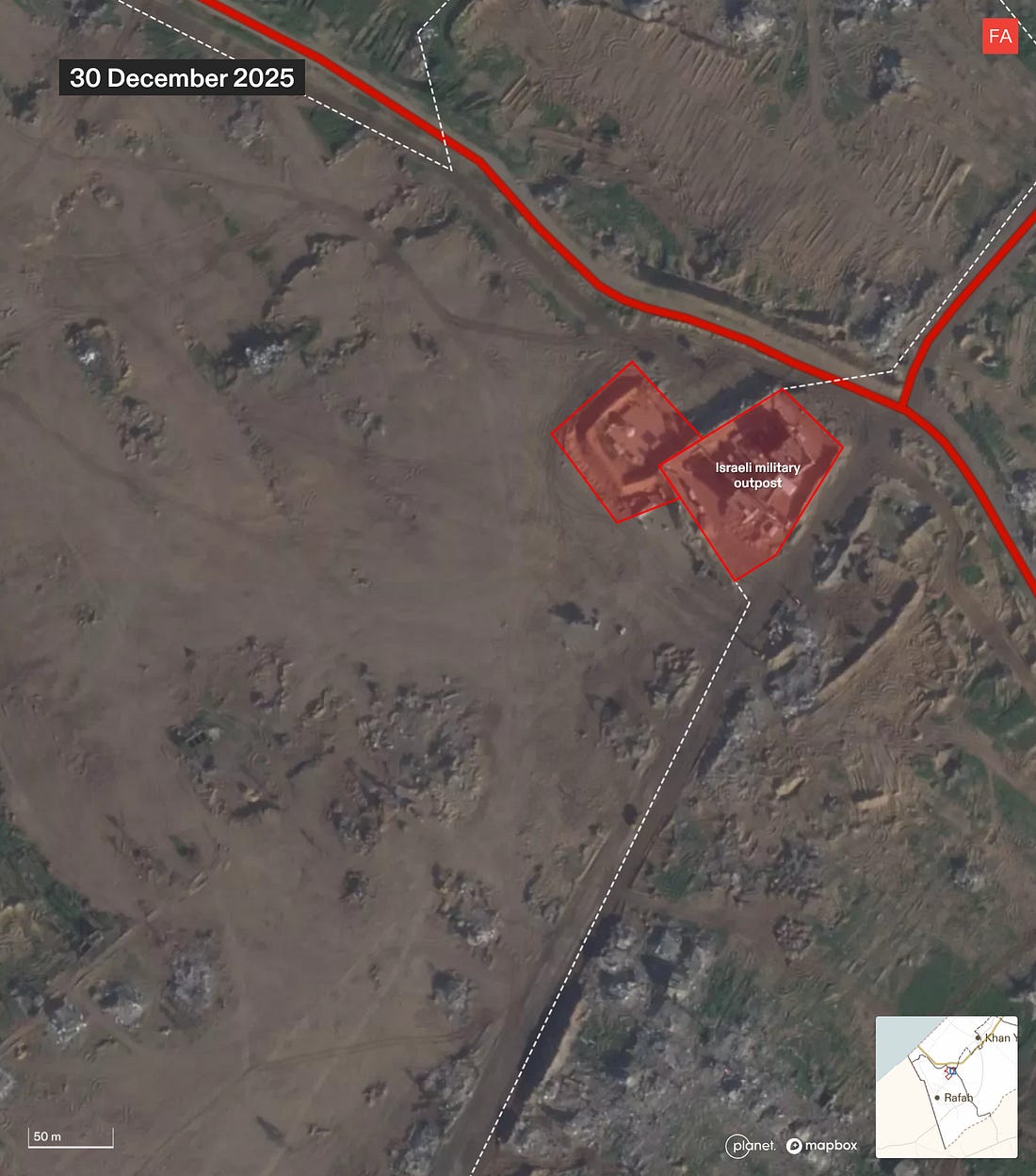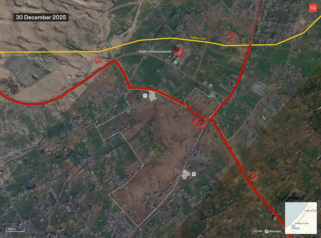 Israel Is Preparing Land in Rafah to Corral Palestinians into an Area Under Full Military OccupationSatellite images analyzed by Forensic Architecture show Israel razing land, compacting the ground, and clearing rubble in Rafah in a way that is not visible anywhere else east of the yellow line.Drop Site is a reader-funded, independent news outlet. Without your support, we can’t operate. Please consider making a 501(c)(3) tax-deductible donation today. ![]() Israel is razing a strategic area of Rafah in southern Gaza, compacting the ground, and clearing rubble in a way that suggests the land is being prepared for the construction of new residential infrastructure, according to new research by Forensic Architecture. The findings, which are based on an analysis of satellite imagery, suggest that Israel is beginning to build infrastructure which may be used to house Palestinians and effectively contain them in an area under full Israeli military control. Since the so-called ceasefire went into effect on October 10, Israel has engaged in widespread destruction of buildings and infrastructure across the more than 53% of Gaza that it occupies east of the yellow line. However, this pattern of Israeli activity—razing the land, compacting the ground, and clearing the rubble—is not visible at this scale anywhere else east of the yellow line. The activity is centered in an area around 1 square kilometer in Rafah at the intersection of the two military corridors. The location lies on the northern edge of what Israeli Defense Minister Israel Katz first announced in July would be a planned “humanitarian city” that would eventually house the entire population of the Gaza Strip. More recently, it emerged in November that the Trump administration was reportedly planning the construction of a number of residential compounds, dubbed “Alternative Safe Communities,” in areas east of the yellow line to provide housing to tens of thousands of Palestinians. The Israeli military was expected to begin clearing the first site for those compounds in Rafah, according to the New York Times. Earlier this month, Israeli military officials told Haaretz that the area is designated for the construction of a residential zone for around 20,000 people. The Israeli military did not immediately respond to an inquiry from Drop Site News about the site. The Full Forensic Architecture AnalysisNew development site on the ruins of RafahSince December, Israel has undertaken groundwork for what seems to be a development site in east Rafah, within the Israeli military-controlled zone. It sits at the intersection of the Morag and Magen Oz corridors, close to the “yellow line.” Our analysis of satellite imagery suggests that this area is being prepared for the construction of infrastructure, possibly as part of Phase 2 of Trump’s plan to build so-called “Alternative Safe Communities” to house tens of thousands of “non-Hamas affiliated” Palestinians within the Israeli-controlled area. The area is relatively intactA close-up of the area shows that in March 2025, at the end of the ceasefire, the area still contained residential buildings and greenhouses relatively untouched by Israel’s military campaign. Structures are destroyed, and the land is partially clearedIn the months that followed, Israel renewed its ground invasion in Rafah, carrying out largescale destruction and clearing part of the land. A military outpost was constructed in the northeastern corner of the area, along the new Morag corridor. The land is cleared and the ground is compactedAfter the second ceasefire came into effect, Israel expanded the military outpost. Since December, it has completely cleared the area and compacted the ground. Rubble from the destruction is clearedOnce cleared and compacted, the Israeli military removed the rubble of buildings it had previously destroyed. In doing so, Israel has not only erased the existence of Palestinian homes, greenhouses, and agricultural land, but the physical evidence of its destruction, as well as any bodies possibly buried under the rubble. Amid ongoing destruction and clearing, this pattern of activity is notableZooming out on the satellite image from 30 December 2025, you can see that, while destruction and clearing are ongoing across Rafah, this pattern of groundwork — razing the land, compacting the ground, and clearing the rubble — is so far contained to this 1 kilometer squared. Satellite images show rubble being collected along the perimeter of the area. Source: Planet Labs PBC.The area is surrounded by military infrastructureThe area of interest is half a kilometer into Israel’s area of control, bound by two military corridors, and near the camp of the Israeli-affiliated “Counter-Terrorism Strike Force,” several military outposts, and former GHF sites. This environment suggests supervision and control, rather than humanitarianism. “Humanitarian” infrastructureRafah has been cited in numerous Israeli plans for “humanitarian” or “transit” infrastructure, and as part of Israel’s efforts to concentrate Palestinians in southern Gaza, near the border with Egypt. The area of interest is on the northern edge of the planned “humanitarian city” in Rafah — a “secure” zone intended to concentrate Gaza’s population, that Israeli defense minister Israel Katz announced in July 2025. Rafah is also where the Israeli military was reportedly expected to start clearing the first site for one of the “Alternative Safe Communities.” To read more of Forensic Architecture’s analysis of Israel’s conduct during the ceasefire visit frames.forensic-architecture.org/gaza/ceasefire. For additional maps and data on Israeli military conduct in Gaza since October 2023, visit gaza.forensic-architecture.org/database Become a Drop Site News Paid SubscriberA paid subscription gets you:✔️ 15% off Drop Site store ✔️ Access to our Discord, subscriber-only AMAs, chats, and