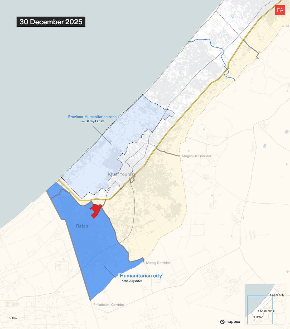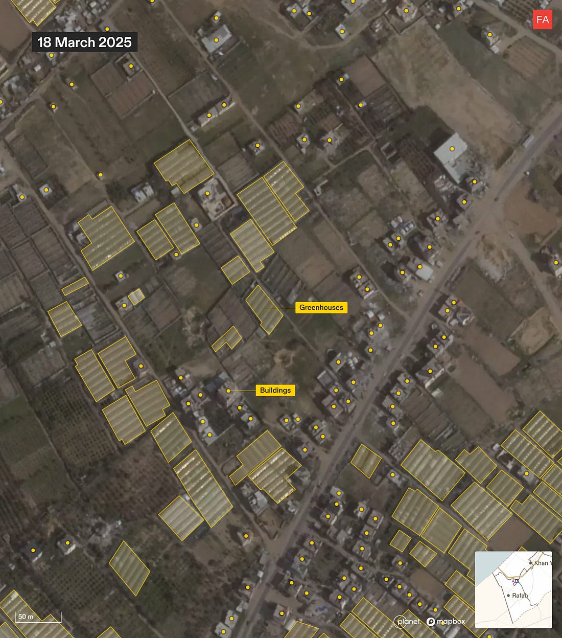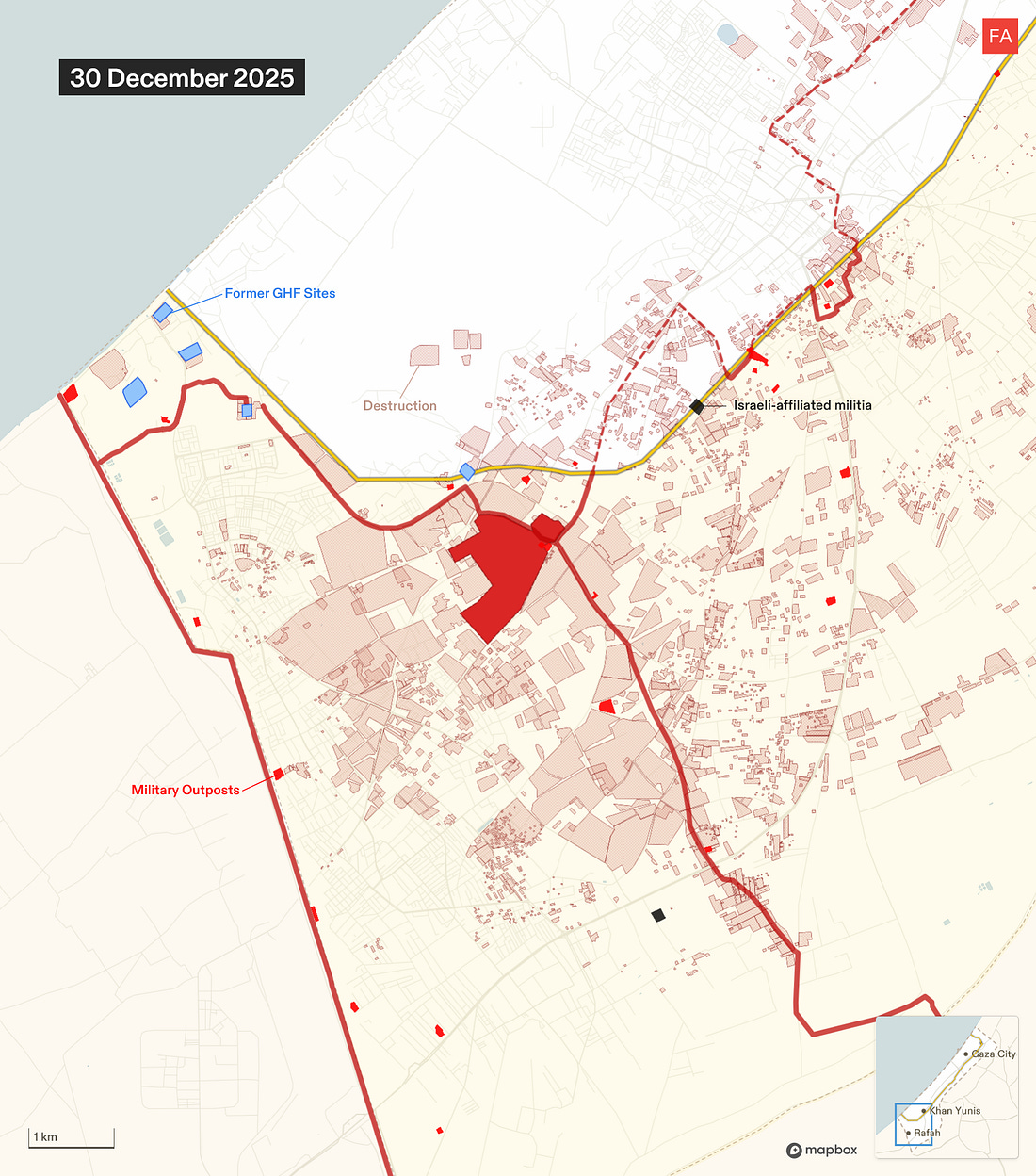 Israel Is Preparing Land in Rafah to Corral Palestinians into an Area Under Full Military OccupationSatellite images analyzed by Forensic Architecture show Israel razing land, compacting the ground, and clearing rubble in Rafah in a way that is not visible anywhere else east of the yellow line.Drop Site is a reader-funded, independent news outlet. Without your support, we can’t operate. Please consider making a 501(c)(3) tax-deductible donation today. ![]() Israel is razing a strategic area of Rafah in southern Gaza, compacting the ground, and clearing rubble in a way that suggests the land is being prepared for the construction of new residential infrastructure, according to new research by Forensic Architecture. The findings, which are based on an analysis of satellite imagery, suggest that Israel is beginning to build infrastructure which may be used to house Palestinians and effectively contain them in an area under full Israeli military control. Since the so-called ceasefire went into effect on October 10, Israel has engaged in widespread destruction of buildings and infrastructure across the more than 53% of Gaza that it occupies east of the yellow line. However, this pattern of Israeli activity—razing the land, compacting the ground, and clearing the rubble—is not visible at this scale anywhere else east of the yellow line. The activity is centered in an area around 1 square kilometer in Rafah at the intersection of the two military corridors. The location lies on the northern edge of what Israeli Defense Minister Israel Katz first announced in July would be a planned “humanitarian city” that would eventually house the entire population of the Gaza Strip. More recently, it emerged in November that the Trump administration was reportedly planning the construction of a number of residential compounds, dubbed “Alternative Safe Communities,” in areas east of the yellow line to provide housing to tens of thousands of Palestinians. The Israeli military was expected to begin clearing the first site for those compounds in Rafah, according to the New York Times. Earlier this month, Israeli military officials told Haaretz that the area is designated for the construction of a residential zone for around 20,000 people. The Israeli military did not immediately respond to an inquiry from Drop Site News about the site. The Full Forensic Architecture AnalysisNew development site on the ruins of RafahSince December, Israel has undertaken groundwork for what seems to be a development site in east Rafah, within the Israeli military-controlled zone. It sits at the intersection of the Morag and Magen Oz corridors, close to the “yellow line.” Our analysis of satellite imagery suggests that this area is being prepared for the construction of infrastructure, possibly as part of Phase 2 of Trump’s plan to build so-called “Alternative Safe Communities” to house tens of thousands of “non-Hamas affiliated” Palestinians within the Israeli-controlled area. The area is relatively intactA close-up of the area shows that in March 2025, at the end of the ceasefire, the area still contained residential buildings and greenhouses relatively untouched by Israel’s military campaign. Structures are destroyed, and the land is partially clearedIn the months that followed, Israel renewed its ground invasion in Rafah, carrying out largescale destruction and clearing part of the land. A military outpost was constructed in the northeastern corner of the area, along the new Morag corridor. The land is cleared and the ground is compactedAfter the second ceasefire came into effect, Israel expanded the military outpost. Since December, it has completely cleared the area and compacted the ground. Rubble from the destruction is clearedOnce cleared and compacted, the Israeli military removed the rubble of buildings it had previously destroyed. In doing so, Israel has not only erased the existence of Palestinian homes, greenhouses, and agricultural land, but the physical evidence of its destruction, as well as any bodies possibly buried under the rubble. Amid ongoing destruction and clearing, this pattern of activity is notableZooming out on the satellite image from 30 December 2025, you can see that, while destruction and clearing are ongoing across Rafah, this pattern of groundwork — razing the land, compacting the ground, and clearing the rubble — is so far contained to this 1 kilometer squared. Satellite images show rubble being collected along the perimeter of the area. Source: Planet Labs PBC.The area is surrounded by military infrastructureThe area of interest is half a kilometer into Israel’s area of control, bound by two military corridors, and near the camp of the Israeli-affiliated “Counter-Terrorism Strike Force,” several military outposts, and former GHF sites. This environment suggests supervision and control, rather than humanitarianism. “Humanitarian” infrastructureRafah has been cited in numerous Israeli plans for “humanitarian” or “transit” infrastructure, and as part of Israel’s efforts to concentrate Palestinians in southern Gaza, near the border with Egypt. The area of interest is on the northern edge of the planned “humanitarian city” in Rafah — a “secure” zone intended to concentrate Gaza’s population, that Israeli defense minister Israel Katz announced in July 2025. Rafah is also where the Israeli military was reportedly expected to start clearing the first site for one of the “Alternative Safe Communities.” To read more of Forensic Architecture’s analysis of Israel’s conduct during the ceasefire visit frames.forensic-architecture.org/gaza/ceasefire. For additional maps and data on Israeli military conduct in Gaza since October 2023, visit gaza.forensic-architecture.org/database Become a Drop Site News Paid SubscriberA paid subscription gets you:✔️ 15% off Drop Site store ✔️ Access to our Discord, subscriber-only AMAs, chats, and