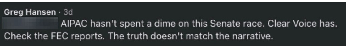 As a reader-funded independent news outlet, we operate free from the influence of governments and corporate backers. This is essential to our mission: to report on what matters most, beholden only to the truth. In that spirit, we made a commitment to ensure that our journalism is free for everyone, not locked behind a paywall. But that means we rely on the voluntary support of our community of readers. Please consider making a tax-deductible donation to support our work today. As the Minnesota Democratic primary to succeed the retiring Sen. Tina Smith in the United States Senate heats up, Rep. Angie Craig is privately distancing herself from AIPAC. While courting the crucial endorsement of the Democratic-Farmer-Labor (DFL) party, Craig’s campaign staffers have told DFL delegates that the pro-Israel lobby is not funding her candidacy, according to messages obtained by Drop Site News. AIPAC has held at least a dozen fundraisers for Craig, however, over the course of the past year. Craig’s behind-the-scenes communications are an indication of AIPAC’s growing toxicity in primary races as it advocates blanket U.S. support for a state committing an unpopular and brutal genocide in Gaza. In two recent races, AIPAC’s millions in support, once firmly understood as a moniker of credibility with the DC political class and financial protection from grassroots-funded challengers, has proven it can do more harm than good. In Illinois’s 9th congressional district, Laura Fine faced outrage from progressive voters in Evanston and surrounding areas centered around her decision to accept millions from the lobby. Similarly, AIPAC fell flat on its face in New Jersey’s 11th district, spending more than $2 million dollars to defeat pro-Israel AIPAC critic Tom Malinowski, only to help elect Analilia Mejia, who is further to his left. Craig announced her run for Senate in April of last year. AIPAC sent out an email directly fundraising for her in September, and also publicly advertised several fundraisers for Craig between June and December. The email states, “Congresswoman Angie Craig has repeatedly demonstrated the kind of courageous, principled, and pro-Israel leadership our movement needs right now. Angie Craig has been a friend of the community since she was first elected to Congress.” Nevertheless, campaign staffers have sent messages to DFL delegates and voters emphasizing that “AIPAC hasn’t spent a dime in this race” and “Angie Craig has not accepted a PAC check from AIPAC in this race, nor have they endorsed her.” Craig’s campaign did not respond to a request for comment. Since the fall of 2023, AIPAC bundled more than $507,000 for Craig’s congressional campaign committee to support her bids for re-election in 2024 and 2026 respectively. Nearly 40% of these funds, $195,409 raised in 2025, have since been transferred to her Senate campaign. Of course, candidates cannot control who fundraises for them. But Craig benefited from hundreds of thousands in donations from AIPAC’s network before appearing to disavow them this year—after AIPAC proved to be an election liability in two major races with progressive challengers. AIPAC and other special interest groups are not required to report the bundling they do, meaning that PACs are able to come in behind candidates without direct spending, which has to be reported. Craig’s opponent in the Minnesota Senate race, Lt. Gov. Peggy Flanagan is endorsed by the five most progressive senators—Sen. Bernie Sanders (I-VT), Sen. Elizabeth Warren (D-MA), Sen. Ed Markey (D-MA), Sen. Chris Van Hollen (D-MD) and Sen. Jeff Merkley (D-OR), as well as Sen. Tina Smith (D-MN) herself. She is running to Craig’s left on key issues and has no history of AIPAC support. Flanagan also supported Sanders’ Joint Resolution of Disapproval to block offensive arms sales to Israel, which came to the Senate floor for a vote April 15 and failed by votes of 40-59 on blocking bulldozers and 36-63 on blocking bombs. The DFL state convention, where the delegates will vote on which candidate to endorse ahead of the August primary, is in May. Even as Craig attempts to distance herself from AIPAC in name as the lobby has become increasingly toxic in American electoral politics, she continues to align with its agenda. Craig has also consistently voted in favor of sending blank-check military aid to Israel, regardless of whether that be in an offensive capacity or defensive capacity for resources like the Iron Dome. The congresswoman does not have a foreign policy section with updated stances on her campaign website. More than half, 53%, of Democratic voters nationwide, as well as 33% of voters across the political spectrum, said they’d be less likely to vote for a candidate endorsed by AIPAC, according to a YouGov poll from March 30. Another poll conducted earlier that week, sponsored by the adjacent but more liberal pro-Israel group J-Street, found that 40% of Jewish Democrats, and 66% of those under the age of 35, would be less likely to vote for an AIPAC-endorsed primary candidate. A poll conducted by Drop Site and Zeteo from earlier this month suggests that 64% of likely Democratic voters in Michigan are less likely to support a Senate candidate who receives donations from AIPAC and other pro-Israel groups like Democratic Majority for Israel and J-Street, while 10% said they would be more likely. The distancing is quite a turnaround from the last election which, where AIPAC notably spent more than $17 million to defeat former Rep. Jamaal Bowman (D-NY) in June of 2024 and over $8 million more to defeat former Rep. Cori Bush (D-MO) in August that year. Bush is running to reclaim the seat. This year, a poll commissioned by Bush shows her neck and neck with incumbent Rep. Wesley Bell despite AIPAC’s endorsement.