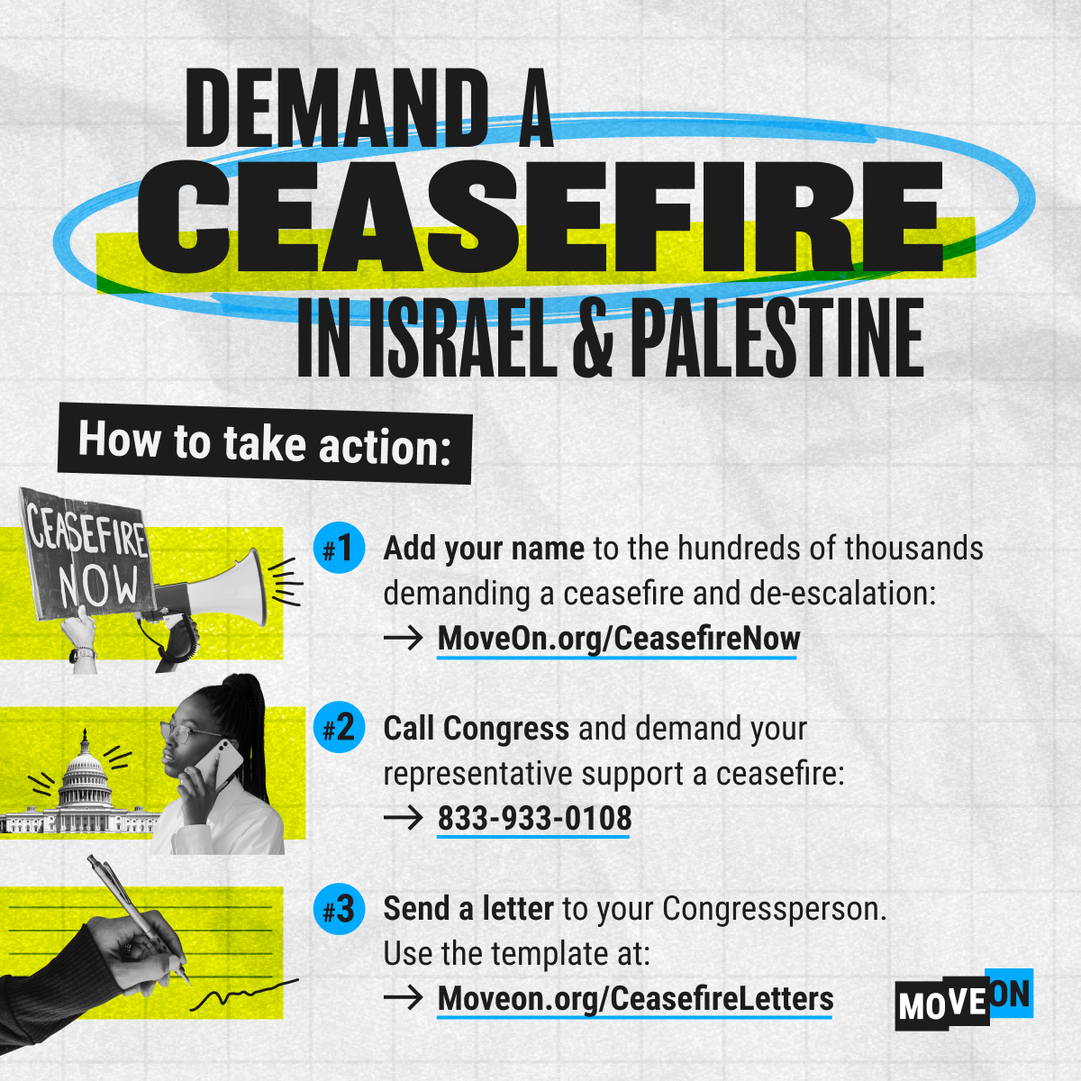 That's why MoveOn members are part of a Day of Action today in support of an immediate ceasefire.