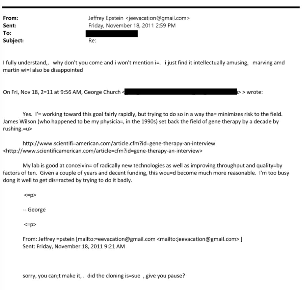 That same year, Epstein had been in contact with leading Harvard geneticists George Church and Gary B. Ruvkun, who won a Nobel Prize in 2024 for his research into micro RNA. Epstein planned to fund Church’s Personal Genome Project at Harvard, and Ruvkun sought Epstein’s support for genomics research to elucidate “pleasure signals in the brain.” Ruvkun wrote to Stephen Kosslyn, later Harvard’s Social Science Dean, “let me know if this subject is too strange for our patron.” The correspondence was forwarded to Epstein, who wrote back, “the patron has no boundaries.” After Epstein’s release from prison on sex crime charges in 2010, he began funding Church’s CRISPR gene-editing research. In November 2011, Church stirred some controversy by telling an interviewer that he hoped to clone a Neanderthal. Epstein wrote to Church a few weeks later, after the scientist declined an invitation to an event, “did the cloning issue , give you pause?” Church replied, “Yes. I’m working toward this goal fairly rapidly but trying to do so in a way that minimizes risk to the field.” “Why don’t you come and i won’t mention it,” Epstein coaxed him. “I just find it intellectually amusing.” Church did not reply to request for comment.