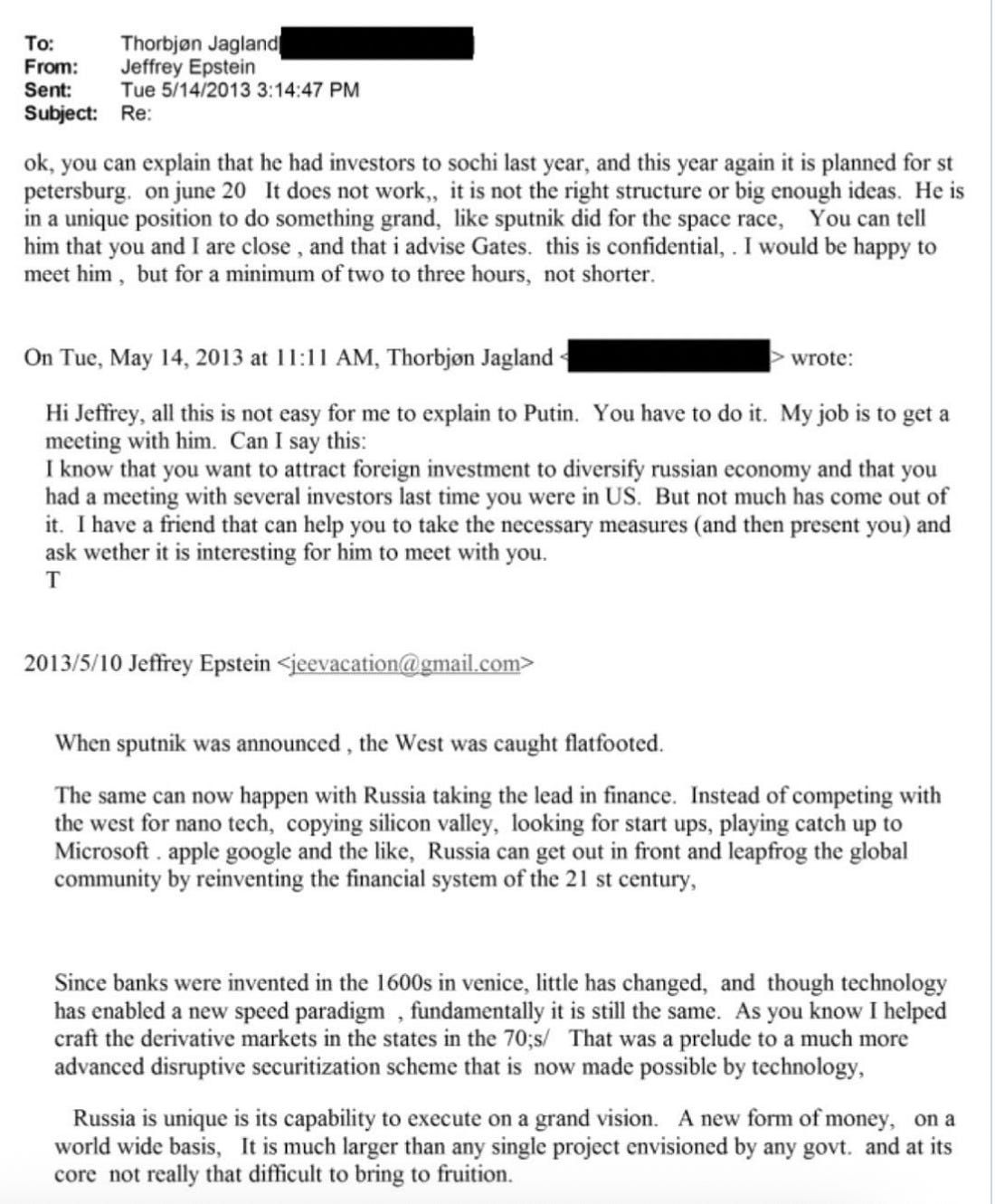 “Find Me The Top Hacker”Epstein’s interest in gene-editing was not purely intellectual; it was personal. Joe Thakuria, Church’s Harvard Medical School colleague, helped Epstein conduct research on his own genome. In June 2014, Thakuria sent Epstein a $193,400 invoice for a package deal to mutate his adult stem cells “to increase longevity,” noting that “If we do this, he, like George Church, would be one of very few people in the world to have this done.” Later that year, Epstein tried to arrange a meeting between Church and Bill Gates to discuss “anti aging” and “genetic fabrication.” MIT received millions of dollars in donations directed by Epstein to support pet projects that happened to closely intersect the frontier research conducted under the Skoltech partnership. Epstein gave his first gift to the MIT Media Lab in 2002, to fund the research of artificial intelligence pioneer Marvin Minsky. Over the next decade, Epstein gave several large gifts to Seth Lloyd, a quantum computing researcher featured at the Russian Quantum Center in Skolkovo, who co-authored papers with Skoltech-funded researchers. Microsoft, the technology conglomerate of which Bill Gates is a founder and major shareholder, also had formal ties to Skolkovo. In 2010, Viktor Vekselberg and Microsoft CEO Steve Ballmer signed a memorandum in Moscow to begin “a wide-ranging series of collaborative initiatives that will underpin the Russian Federation’s technology innovation agenda,” later opening an R&D center at the Skolkovo Innovation Center. Skolkovo was one of several foreign funders of the MIT Media Lab, led by Epstein’s close friend Joi Ito. The Skolkovo partnership funded research grants for high-profile principal investigators like Chilean physicist César Hidalgo and Neri Oxman, hedge fund manager Bill Ackman’s wife, whose research Epstein had personally backed. Epstein was also supporting the work of Madars Virza, a Latvian research scientist working on cryptocurrency at the Media Lab. In 2011, the Skolkovo Foundation funded Virza and Israeli scientist Eli Ben-Sasson’s research on Zerocash, a design for an anonymous cryptocurrency based on “zero-knowledge” cryptographic proofs—also backed by the Defense Advanced Research Projects Agency (DARPA). In emails released by the Justice Department last month, Epstein discussed the cryptographic theory behind Zerocash with Italian hacker Vincenzo Iozzo, “ZeroCash…is essentially a ‘privacy preserving’ version of Bitcoin,” Iozzo wrote to Epstein. “If we use...similar [zero knowledge proofs] for our currency, we can enforce arbitrary rules on how the currency is spent.” Epstein invested in Ben-Sasson and Virza’s Electric Coin Company, to create the Zcash blockchain based on their research. Later, Epstein helped Virza make a bank transfer in the Virgin Islands before a “fork” in the Zcash code. Virza did not reply to request for comment. Epstein’s interests in genes and cryptocurrency were deeply intertwined. He regarded the human genome as a cryptographic puzzle, and wanted to “hack” the genetic code. As early as December 2009, Epstein reached out to Daniel Dubno, a CBS News producer who previously worked with DARPA and the Department of Homeland Security, to “find me the top hacker codebreaker, nsa type,” to assist in analysis of proteins. That month, Epstein contacted MIT parallel computing pioneer Danny Hillis with the same request: “i am looking for nsa quality code theorist. biology at every level involves a host of Alice and Bob interactions, authentication, signnal processing. Noisy channels.” (In cryptographic theory, Alice and Bob are common placeholders for two parties trying to communicate with each other.) In his messages to Hillis, Epstein seemed somewhat conversant in the frontier methods in artificial intelligence research at the time, writing, “THe math gets quite complicated. algebraic topologists ,sometimes look at the intersections in multidimensional spaces,” referring to the practice of representing a high-dimensional object as a collection of overlapping regions, then studying the pattern of their intersections. Dubno followed up with Epstein a few months later, to inform him about a crypto workshop he was planning, with some promising recruits. “A bunch of Israeli hackers are in this with me as well as the chief disruption officer at Darpa, Dr. Peter Lee,” Dubno wrote. He added, “I’d design this so you’d get your questions answered if you’d help me get mine.” Epstein replied, “Im in.” Dubno visited Epstein’s island within a matter of days. Hillis and Dubno did not reply to requests for comment. For the next decade, Epstein continued to recruit engineers from U.S. national security entities, including DARPA, to his genome hacking project. He asked Kathryn Ruemmler, the White House attorney who had handled the legal fallout from the Edward Snowden leaks, to help him source cryptographers from the National Security Agency. “Can you find a guy from nsa that can think about signal intelligence applied to DNA,” Epstein wrote . “I want to intercept communication between living cells in organisms.” In late 2012, he had sent the same request to Boris Nikolic, Bill Gates’ top aide: “do you have any contacts at nsa so that we can use de encypriton (sic) in biological systems?” “Yes,” Nikolic replied, “There are no many places where I do not have someone ;)” “A New Form Of Money”Despite an auspicious start, the partnership between MIT and Skolkovo came under strain in 2012, caught between rising tensions between Washington and Moscow, and an increasingly restrictive political climate within Russia itself. That year, major street protests broke out in Moscow and St. Petersburg against the Russian government. In response to the demonstrations, Putin accused the U.S. of fomenting unrest, and his foreign minister claimed the United States Ag